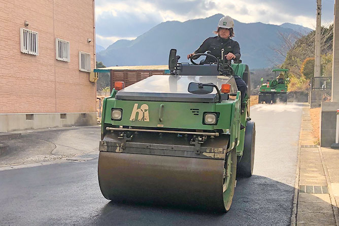 舗装工事の魅力は、形に残るものを作り上げていく達成感。地元地域への貢献度も高く、やりがいの大きい仕事ですよ!