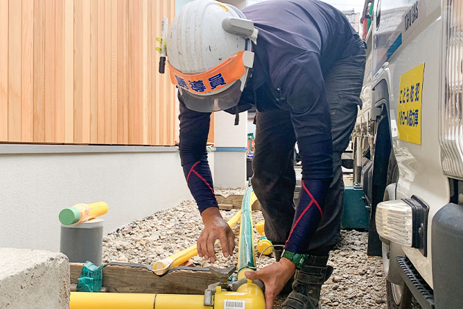 道路に沿って地中に配管される本管の工事、本管から各家庭にガスを引く供給管の工事、ガスを利用するための設備の取り付け、配管工事に伴う土木工事まで、株式会社清水商会ではガスの供給に関わる幅広い工事を行っています。今後は配管の技術を活かし、水道工事などの分野にも挑戦していく予定。現場経験を通していろんな技術を身に付けていきましょう!