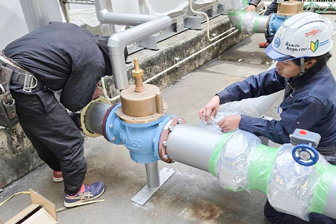 ボイラーの近くや空調のない現場で作業を行うこともあるので体力的な負担はありますが、大巧工業株式会社ではこまめに休憩を入れながら作業を行います。また、スケジュール的に無理のある仕事は引き受けないなど、従業員の安全と健康を第一に考えて仕事を受注しています!