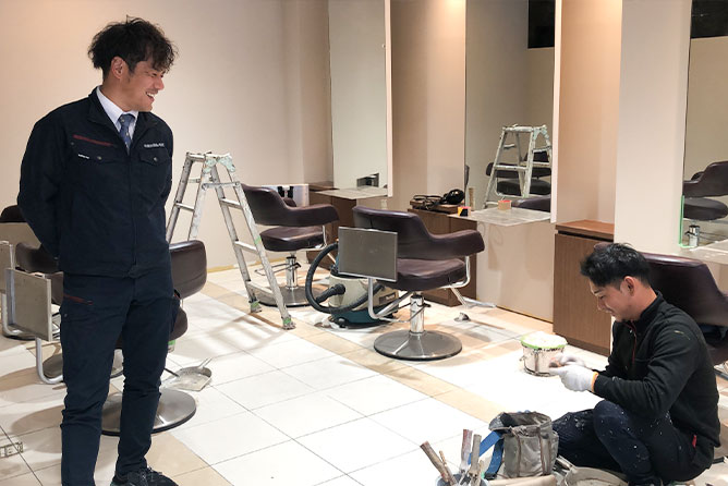 違う職種の人達と連携して、みんなで一つの現場を完成させた時はめちゃめちゃ達成感ありますよ! - 業務の幅が広くて大変なこともあるけど、その分やりがいも大きいですね!打ち合わせから完工まで一貫して関わっていくので手応えがあります。