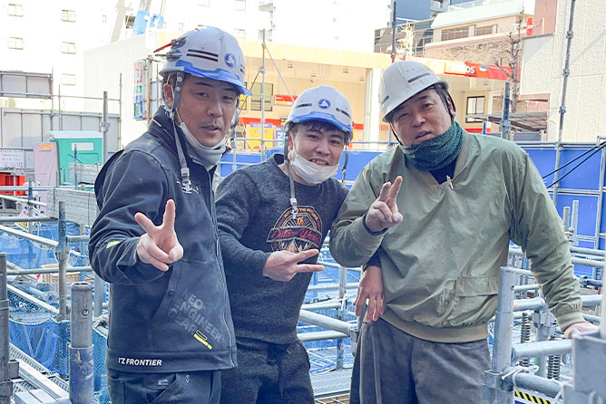 - 現場作業って気を抜くと危険な時もあるので、みんな仕事中は真剣に取り組んでいますね。でも、ピリピリした雰囲気もないし先輩達にも話し掛けやすいですよ。作業してて分からないことが出てきたらすぐ確認するようにしてます。先輩達みんな丁寧に教えてくれますよ!