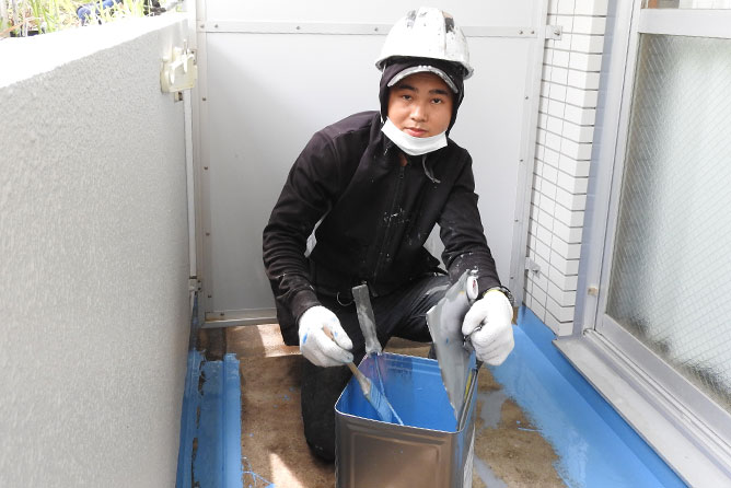 - 防水工事って結構覚えることが多いので、初めは大変でしたね。材料や道具の名前みたいな基本的なことはもちろんなんですけど、他にも知識が必要になる場面はたくさんありました。材料の配分なんかも、慣れてないと難しいんですよ。