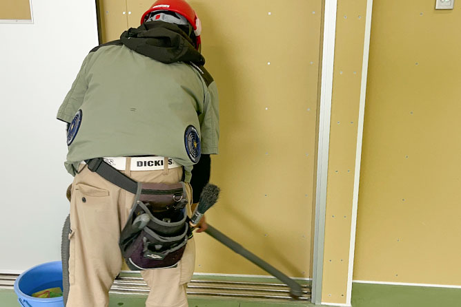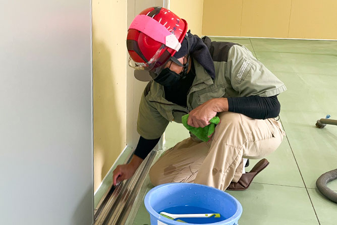 中でも西尾総合ホーム株式会社で請け負う仕事の6~7割を占めているのが、新築物件のクリーニング。建物を建設する過程で溜まった埃や、工事の際に付いた汚れなどを取り除いて隅々まで綺麗にし、お客様に気持ち良く引き渡せる状態にしていきます。また、建築工事を行っている途中でも掃き掃除や養生などの作業を行い、現場を綺麗に保っていきます。