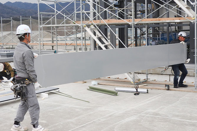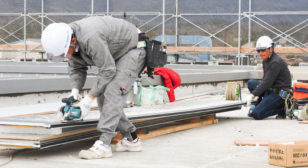 建築板金工事は外での作業が中心。そこで岡板金株式会社では、暑い日はこまめに休憩を入れるなど、従業員の体調にも気を配りながら作業を進めていきます。
