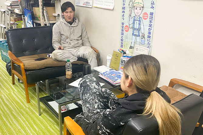 仕事をしていて一番嬉しくなる瞬間は、やっぱり仕上がった後のお客さんの反応を見たり、感想を聞いたりした時かな。塗装工事って結構目に見えて建物の雰囲気が変わるので、すごく喜んでもらえますね。やりがいの大きい仕事だと思いますよ!